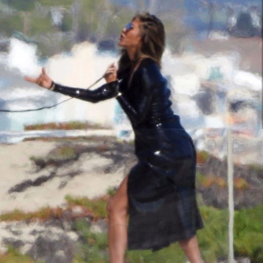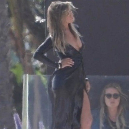 50-летняя Дженнифер Энистон приняла участие в новой фотосессии, кадры с бэкстейджа которой накануне появились в сети. Звезда попала в объективы папарацци во время очередной модной съемки, которая проходила на одном из пляжей Малибу. На кадрах актриса предстает в черном латексном платье-халате с глубоким декольте, обнажающим ее грудь, и разрезом на ноге.