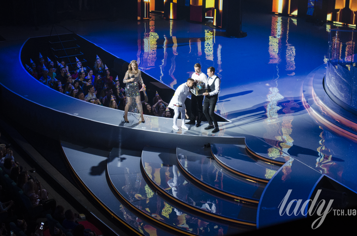 Осадчая прямо на сцене поздравила именинника, подарив ему огромный торт. Кроме того, многие в зале надели на головы праздничные колпаки, что приятно удивило артиста.