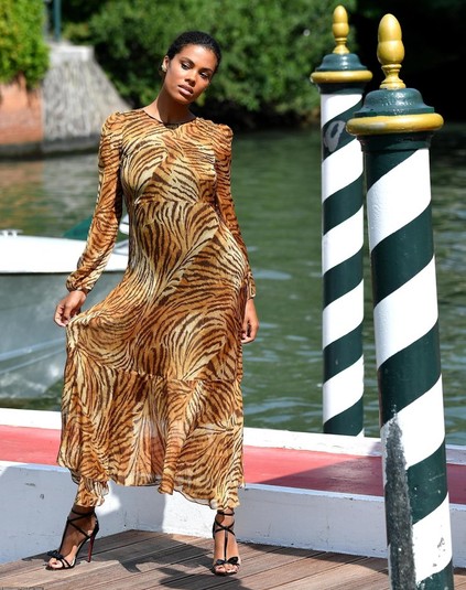 Для прогулки и внезапной фотосессии жена Касселя выбрала платье британского бренда Twinset Milano с анималистичным принтом и изящные черные босоножки.