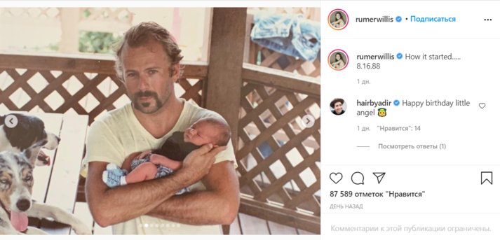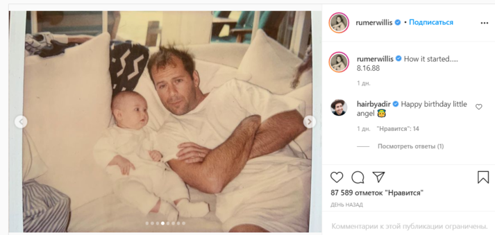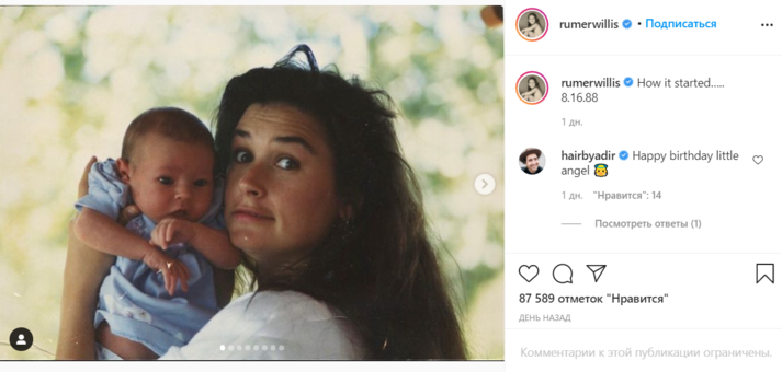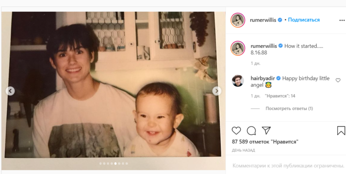 Румер Уиллис, дочь актеров Брюса Уиллиса и Деми Мур, опубликовала архивные фото с молодыми родителями. Снимки появились в ее Instagram-аккаунте.