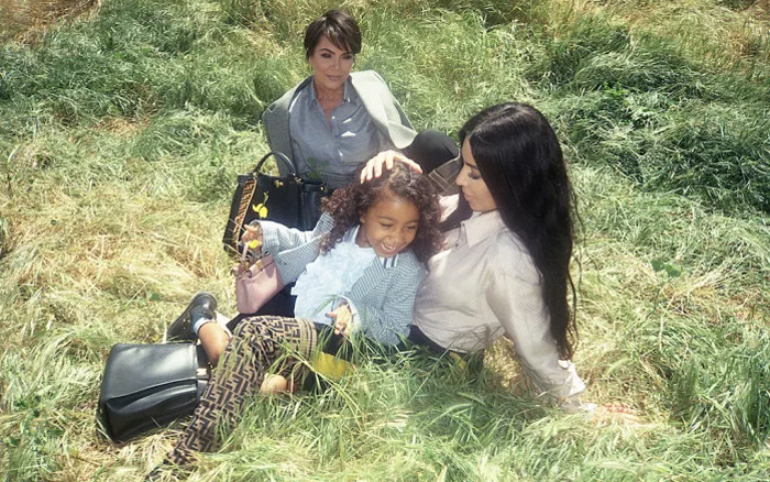 На первых опубликованных снимках три поколения знаменитой семьи изображены на траве и возле бассейна с сумками Fendi. «Так важно быть в кампейне с моей дочерью и мамой», — написала Ким в твиттере.