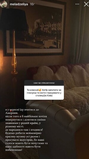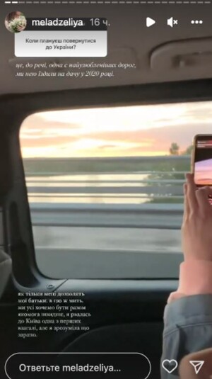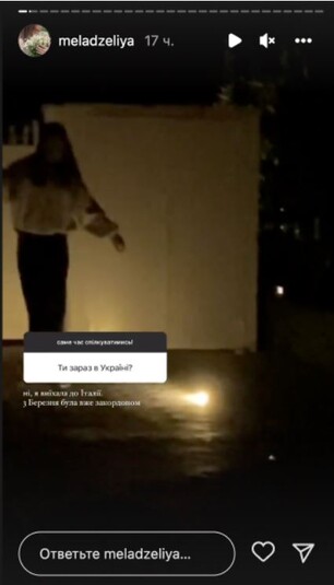 Лия Меладзе в переписке с подписчиками рассказала, что сейчас находится в Италии. Девушка говорит, что очень хочет вернуться домой, но пока не знает, когда это случится: «Как только разрешат мои родители, в этот же момент. Мы все хотим быть вместе как можно скорее. Я рвалась в Киев одной из первых вообще, но поняла, что рано». Кроме этого, Лия Меладзе рассказала о планах на будущее. В сентябре девушка уезжает США на учебу.