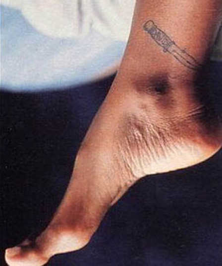Свою же татуировку Иман набила давно, но ни разу не показывала ее поклонникам. На ноге модели красуется рисунок в виде большого тесака с особой формой клинка, носящего название «нож Боуи». У этого имеется предыстория: музыкант в 19 лет сменил имя Дэйви Джонс на Дэвид Боуи в честь американского авантюриста XIX века Джеймса Боуи, популяризировавшего такие тесаки.