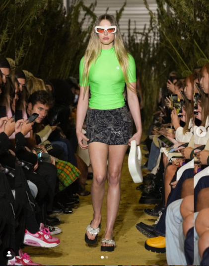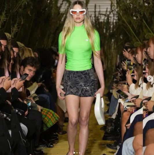 23-летняя Ив Джобс, младшая дочь сооснователя компании Apple Стива Джобса, дебютировала на Парижской неделе моды в рамках показа французского бренда Coperni. Модель вышла на подиум в неоновом облегающем топе и черной мини-юбке. Образ дополнили крупные солнцезащитные очки, сумка и вьетнамки на массивной подошве.