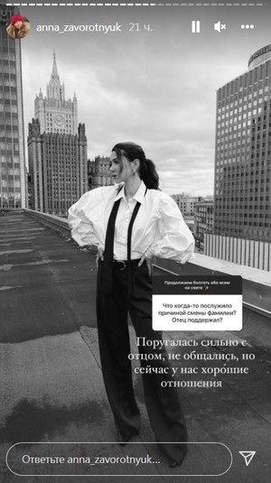 Также подписчики поинтересовались, зачем Аня поменяла фамилию: была Стрюковой, стала – Заворотнюк. Девушка объяснила, что в какой-то момент поссорилась с папой и посчитала, что так будет лучше. Но сейчас у нее с отцом, по ее словам, хорошие отношения.