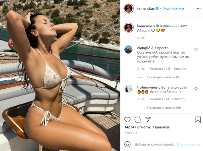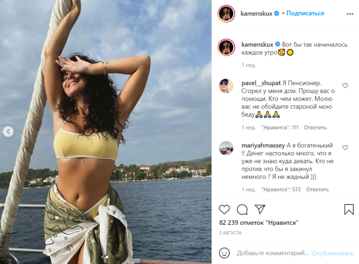 Исполнительница обнародовала новые фото, которые сделала на роскошной яхте. Звезда обожает отдых на море, поэтому часто арендует транспорт для водных прогулок. Настя предстала перед камерой в нежно-желтом купальнике с цветочным принтом на завязках. Поверх надела легкое голубое парео, застегивающееся на пуговицы.