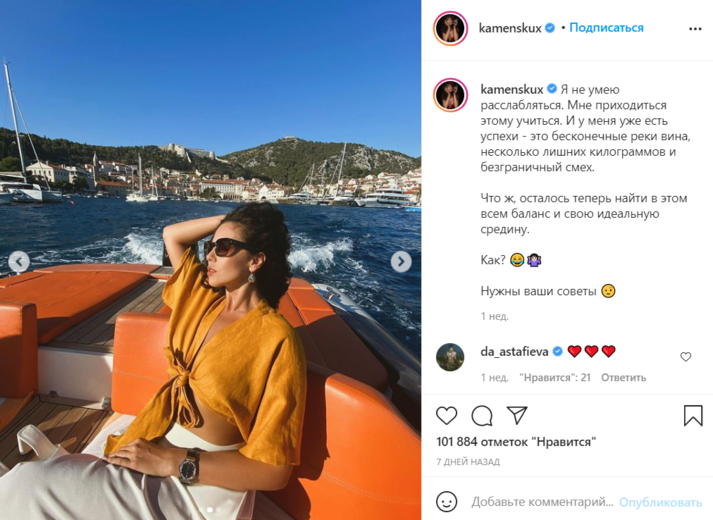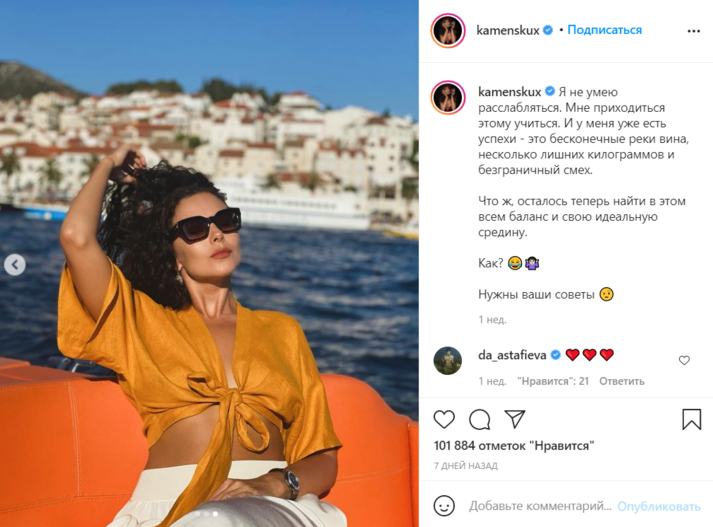 Этим летом в перерыве между гастролями Настя Каменских с семьей и друзьями отдохнула в Хорватии. Она часто публиковала фото с отдыха и щеголяла новыми летними образами.