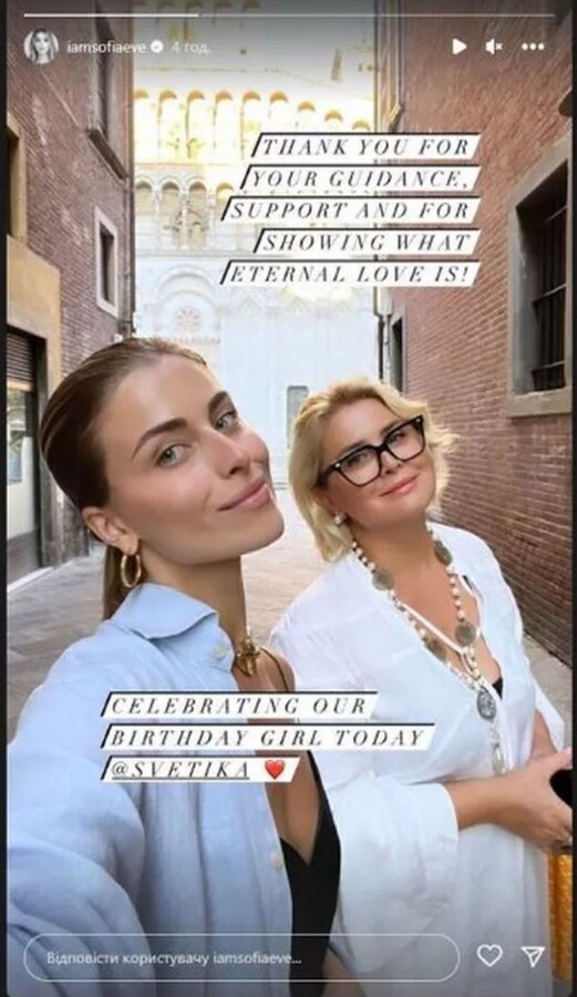 Софія Михайлівна опублікувала фото іменинниці та написала: «Дорога Світланочко, з днем народження». Дочка Світлани Євдокименко теж привітала іменинницю. Соня на своїй сторінці в Інстаграм написала англійською: «Дякую за твоє керівництво, підтримку та демонстрацію, що вічне кохання є».