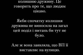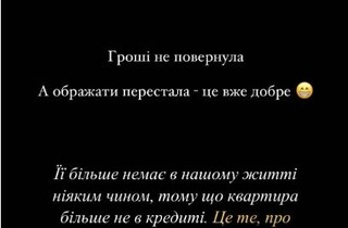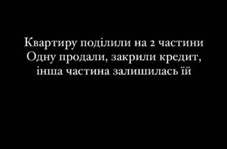 «Рівно рік тому на всю країну прогриміла новина про те, що мій чоловік виганяє на вулицю свою колишню дружину. І от нарешті ця історія закінчилася. Звісно, на меті ніколи не було виганяти колишню дружину на вулицю, і сьогодні ця квартира поділена, кредит закритий, і частина квартири переписана на колишню дружину. Я маю документи, де вказано, що вона не має претензій до колишнього чоловіка. Рієлтор зробив щось нереальне, він продав частину квартири під час війни», – похвалилася Катерина.