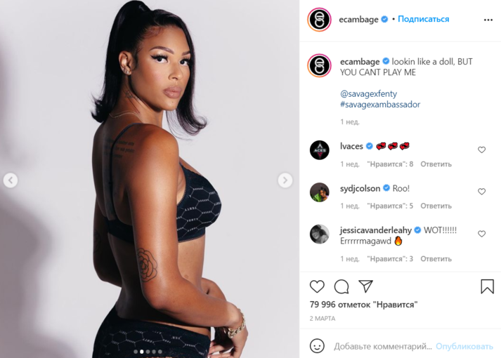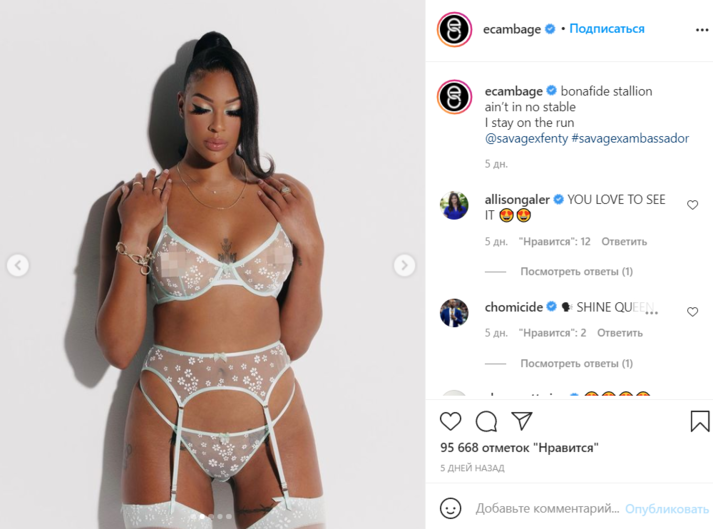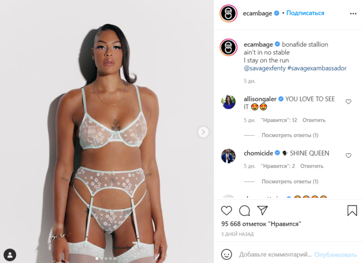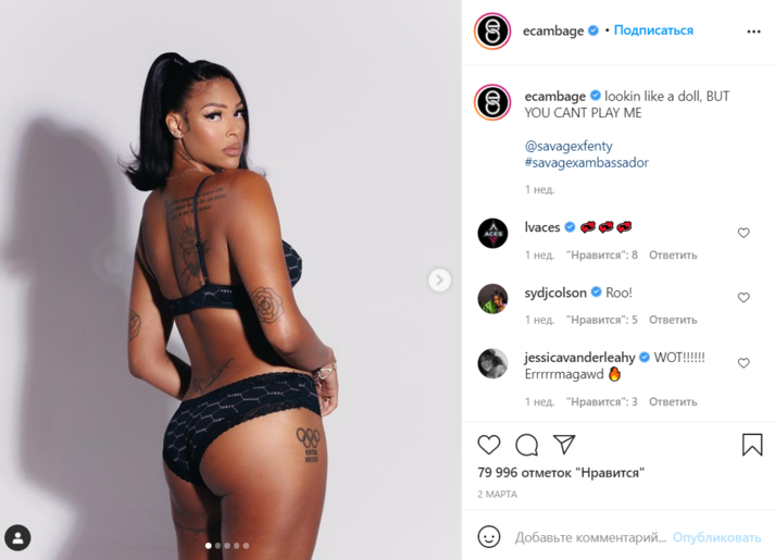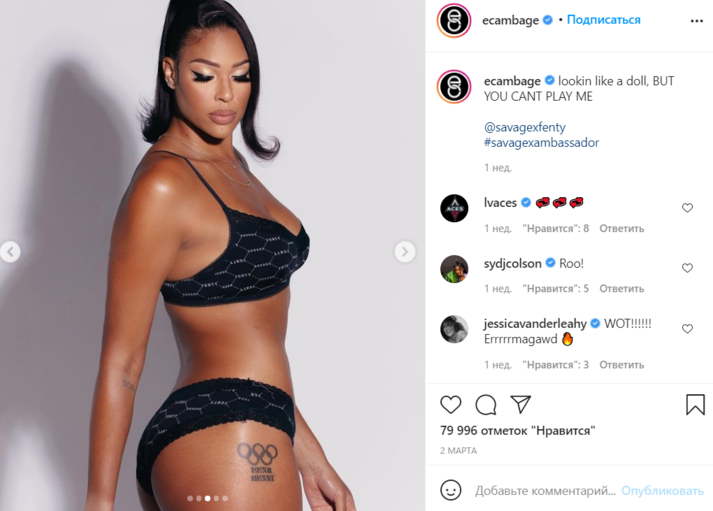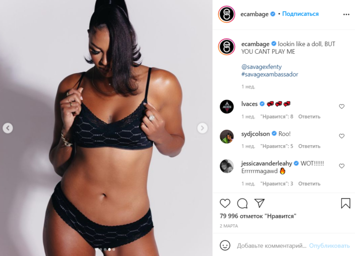 Во время одной из последних фотосессий красавица позировала в нижнем белье от бренда Рианны Savage x Fenty. Лиз надела белый комплект с чулками и поясом, показывая на камеру свои соблазнительные формы и татуировки. Не смутило спортсменку и то, что ее наряд оказался прозрачным. Однако, чтобы жаркие фото не удалили из ее инстаграма, она предпочла замазать самые пикантные места.