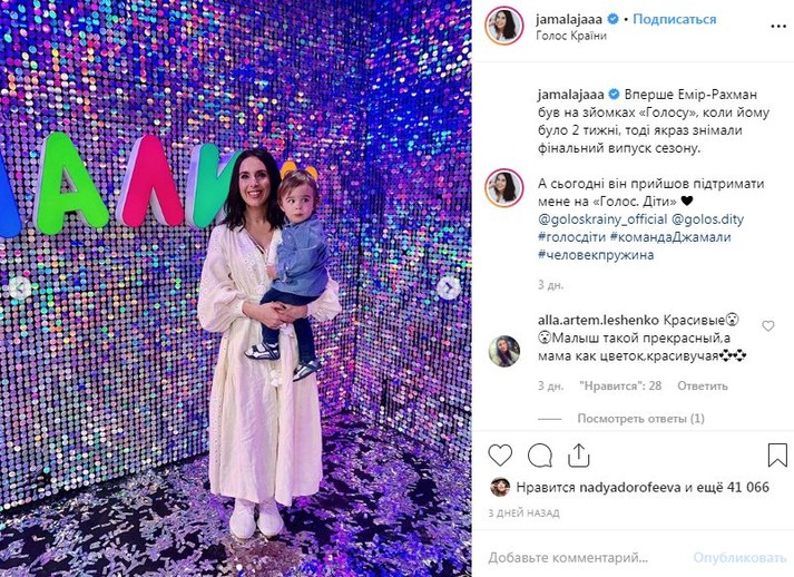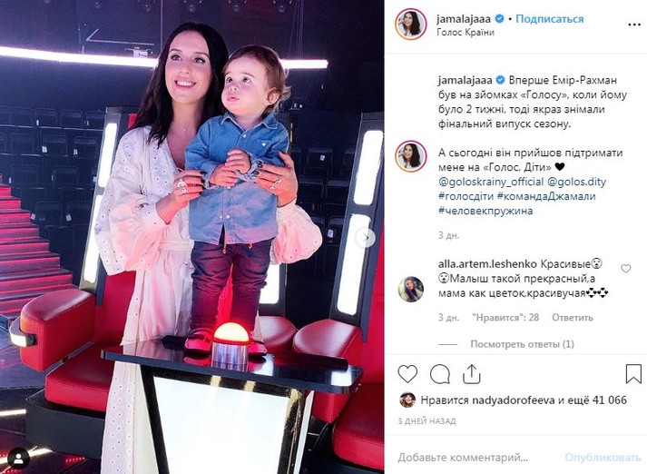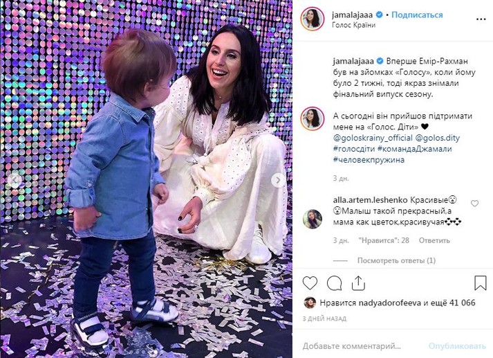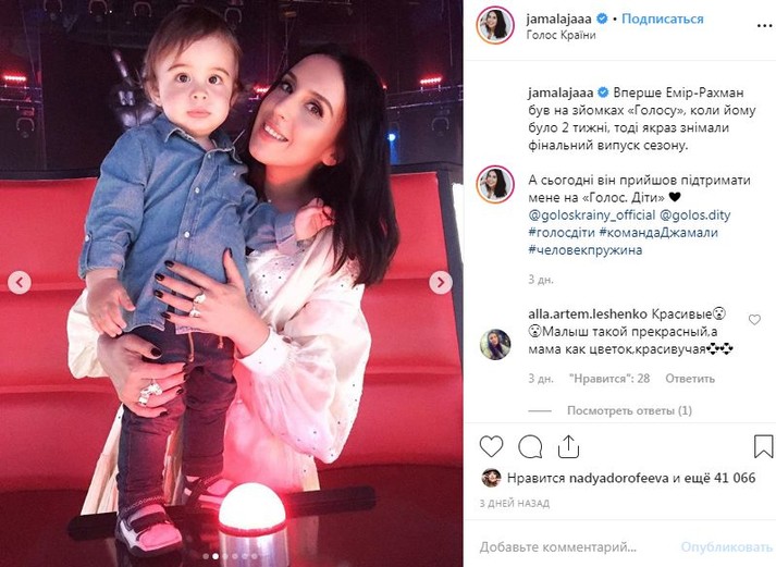 «Впервые Эмир-Рахман был на съемках «Голос. Діти», когда ему было две недели, тогда как раз снимали финальный выпуск сезона. А сегодня он пришел поддержать меня на «Голос. Діти», – написала в микроблоге Джамала.