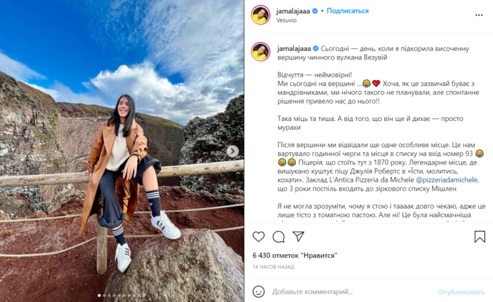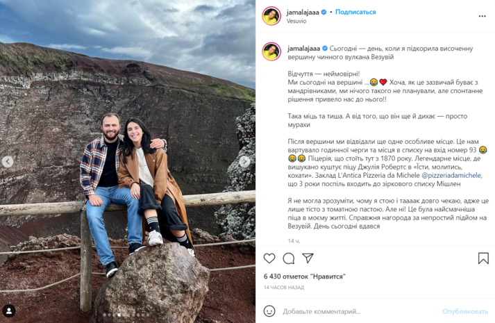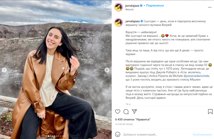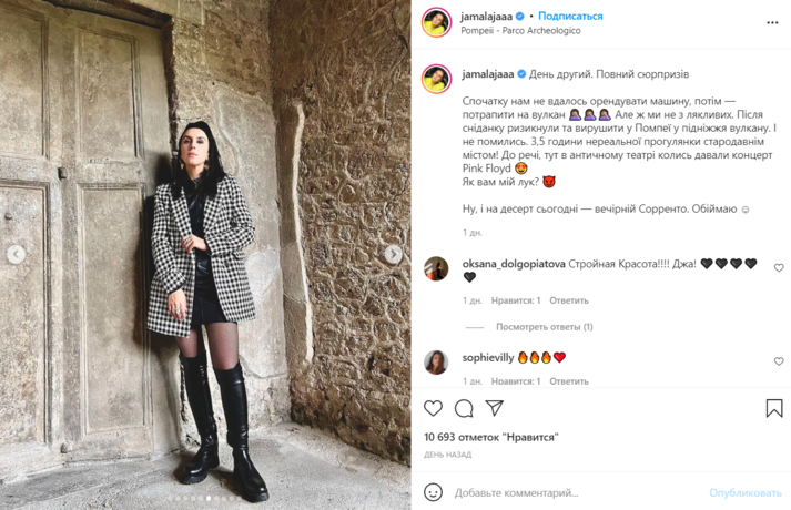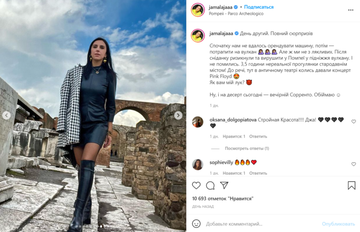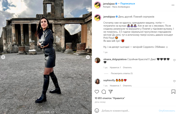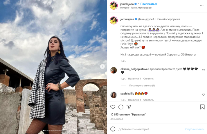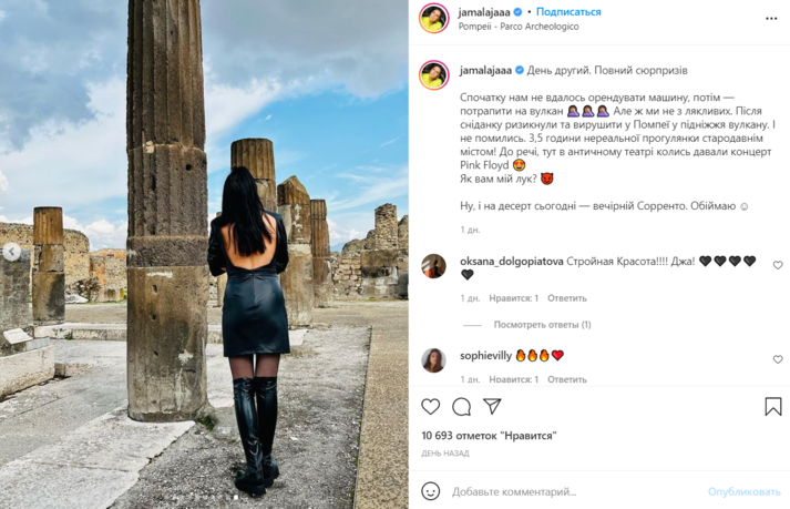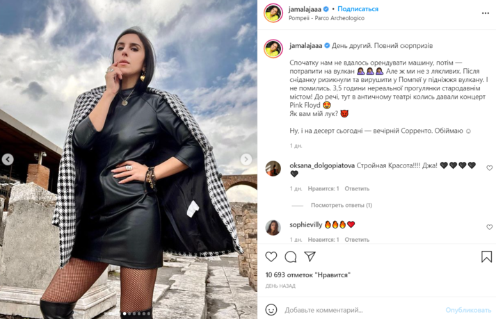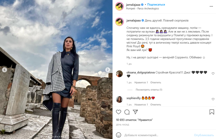 По словам певицы, они с любимым Бекиром планировали подняться на вулкан Везувий, однако их планы внезапно изменились. Похоже, это к лучшему, ведь даже в древнем городе Джамала чувствовала себя не слишком комфортно из-за экстремальной длины платья.