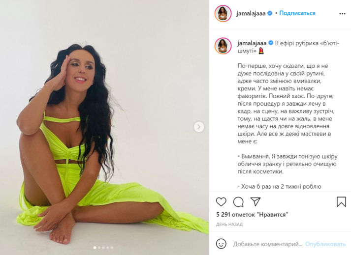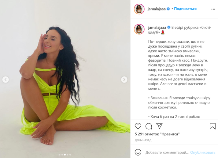 «Dermadrop - "холодный" массаж. Ощущение, будто зима не просто близко, а прямо на моем лице. Процедура не требует уколов, не оставляет следов, только приятное ощущение и классное состояние кожи. БМС — это особый вид гимнастики со стимулятором для мягких мышц лица и шеи. Крутая штука, рекомендую», — перечислила Джамала.