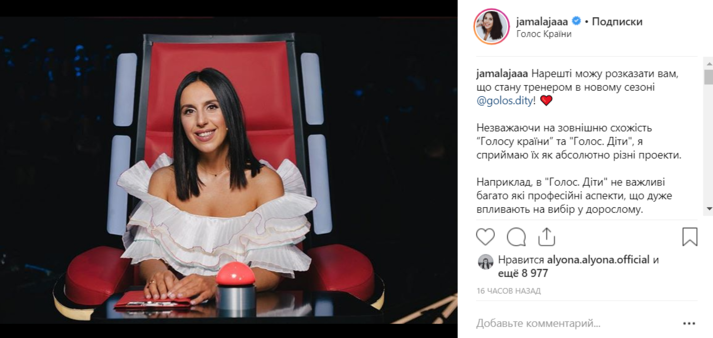 На этот раз поп-исполнительница займет кресло судьи в проекте «Голос. Діти». Об этом Джамала сообщила поклонникам на своей странице в Instagram, отметив, что очень рада будет возможности поработать с детьми.