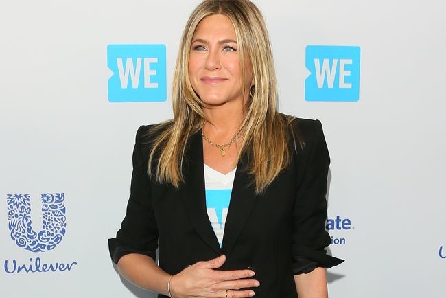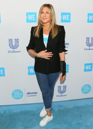 А вчера Энистон стала участницей ежегодного молодежного форума WE Day в Калифорнии. Для этого шоу она выбрала молодежный образ: синие джинсы, белую футболку с логотипом и пиджак. Свой наряд артистка дополнила белыми кедами.