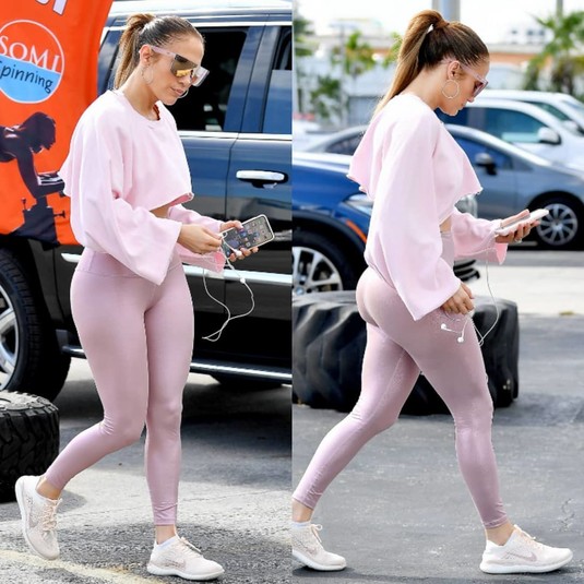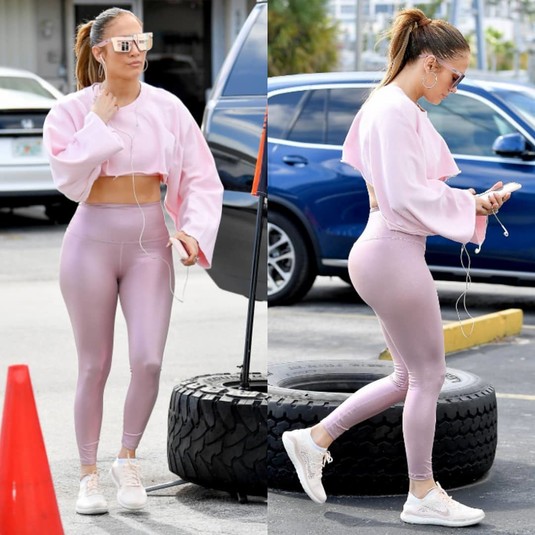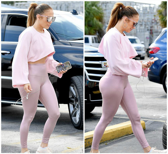 На певице были также надеты облегающие светло-розовые блестящие легенсы. Они эффектно подчеркивали ее роскошные ягодицы. Свой образ Лопес завершила серебристыми солнечными очками. Волосы Дженнифер зачесала в высокий хвост. Певица предпочла остаться практически без макияжа.