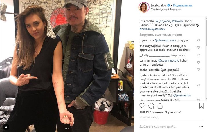 Многодетная мамочка поделилась в Instagram снимком, на котором позирует с известным тату-мастером из Лос-Анджелеса Доктором Ву, а на её руке красуются три созвездия, олицетворяющие знаки зодиака её детей. «Онор — Близнецы, Хэвен — Лев, Хэйес — Козерог», — объяснила Альба.