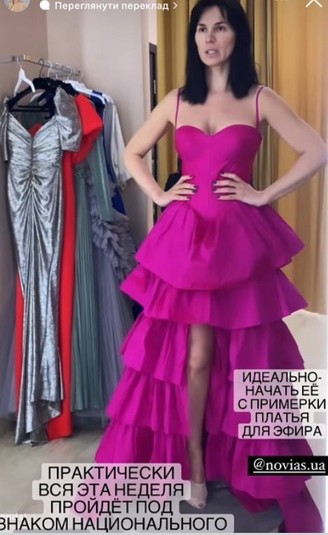 Телеведущая Маша Ефросинина, которая в этом году стала ведущей Нацотбора на Евровидение, выбирала платье для церемонии вместе со своими подписчиками в соцсети. На суд поклонников артистка представила четыре очень разных наряда. Первое – цвета фуксии с акцентным лифом, пышным низом с воланами и разрезом посередине. Второе – серебряное, приталенного фасона с рукавами-фонариками, камнями на декольте и пикантным разрезом. Третье – ярко-красное платье прямого кроя с разрезом и асимметричным верхом, обнажавшим одно плечо. Последним она надела роскошное золотое платье, расшитое пайетками, с глубоким декольте и откровенным разрезом до бедер.