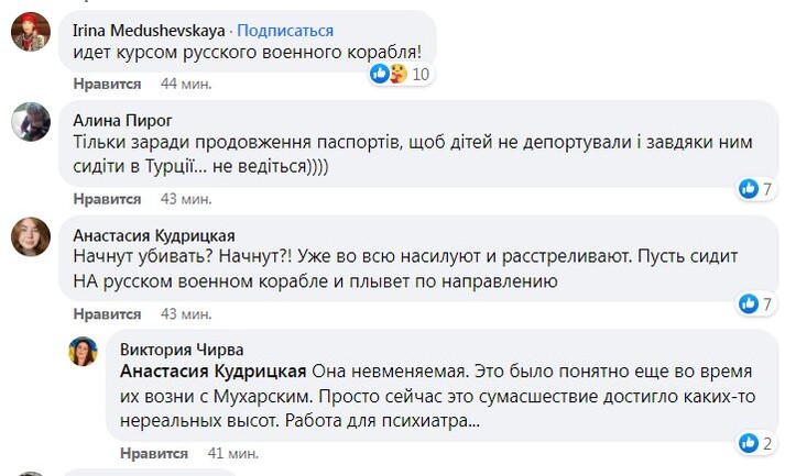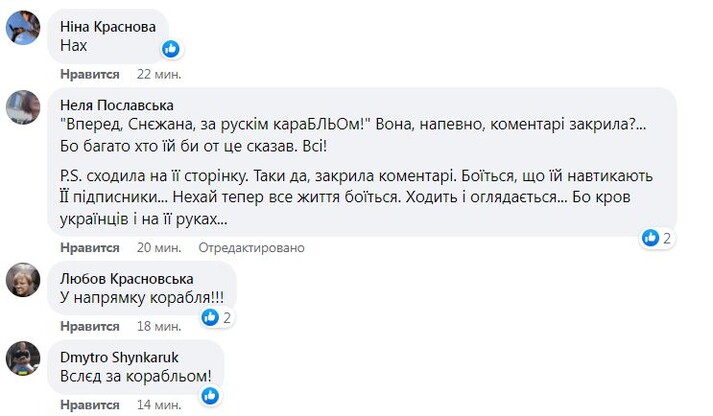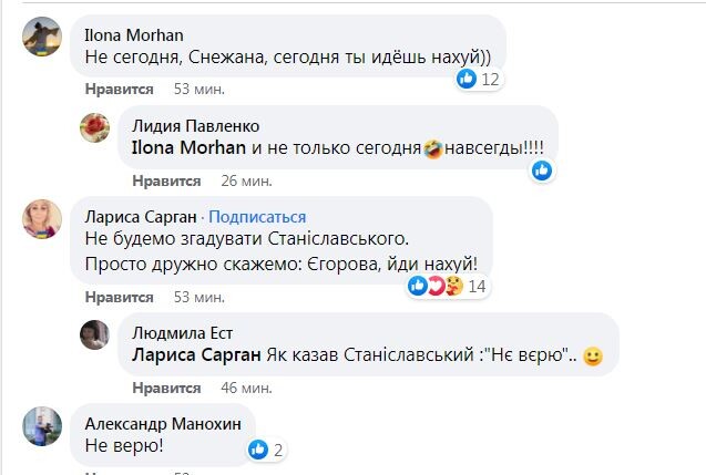 Комментарии к этому посту Егорова закрыла, но запись уже «гуляет» по соцсетям, и украинцы, к которым обращается бывшая телеведущая, пишут в комментариях, что не верят в искренность ее раскаяния. Мол, скорее всего, дело в документах детей. Ну и традиционно, как и всем другим предателям, Снежане предложили последовать курсом русского корабля.