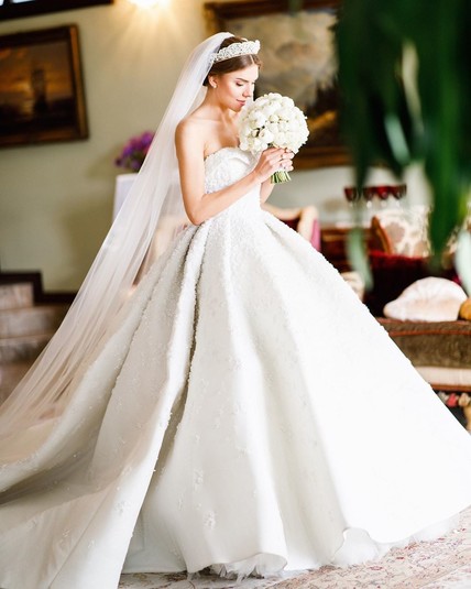 Так, Екатерина выбрала пышное свадебное платье со шлейфом, которую дополнила длинной фатой и тиарой.