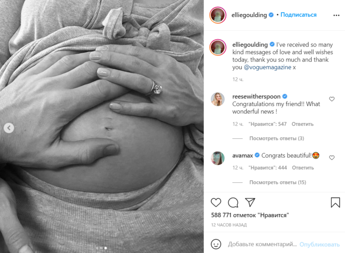 34-летняя британская певица Элли Голдинг находится на восьмом месяце беременности. Артистка призналась, что пополнение в семействе было шоком для нее и возлюбленного. Супруги узнали о будущем малыше, когда находились в романтической поездке в честь первой годовщины свадьбы.
