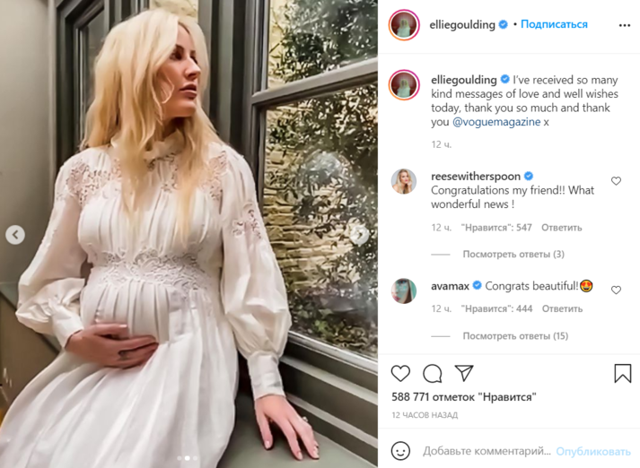 Артистка обнародовала кадры с округлившимся животом. Снимки были сделаны в доме супругов в Глостершире, графстве на западе Англии. Элли позировала в светлых нарядах, подчеркивающих ее изменившуюся фигуру.