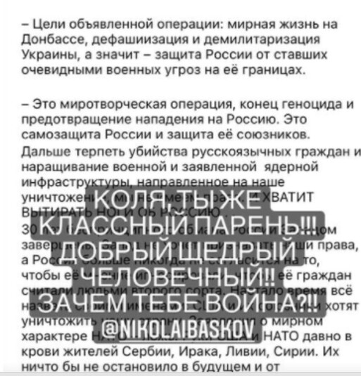 После военного вторжения России на территорию Украины Нателла Крапивина не стала молчать о войне, как многие ее коллеги. Когда Тина Канделаки сообщила на своей странице в соцсети, что новости о том, что в Украине бомбят мирных жителей – это фейк, она написала в сторис Инстаграм, что раньше считала Канделаки другом, но теперь все иначе. А путиниста Баскова, который не уставал прославлять подвиги миротворцы Путина, спросила на его странице в соцсети: «Коля, ты же классный парень! Добрый, щедрый, человечный! Зачем тебе война?»