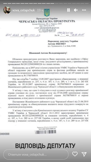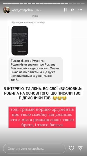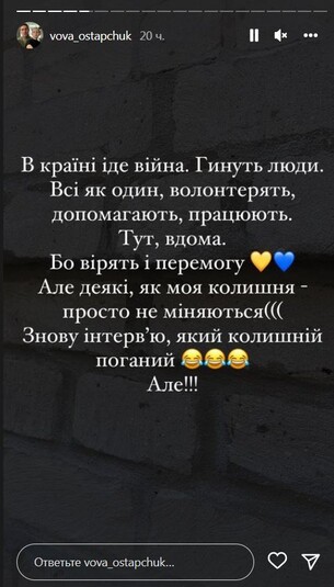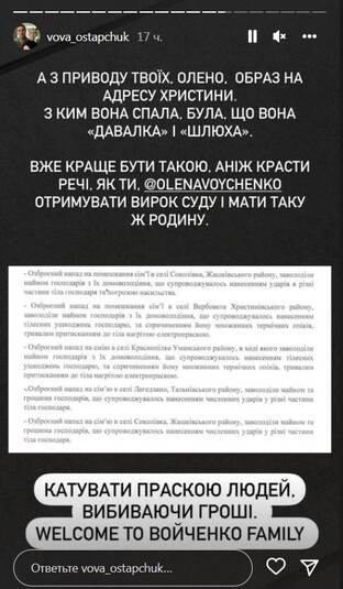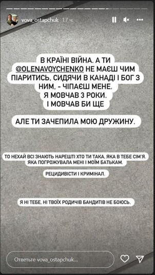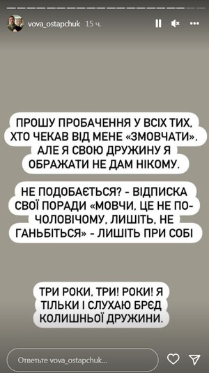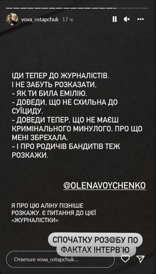 «Я терпел три года. Три года! Потому что есть дети. Потому что я уважаю тебя, как мать наших детей. И это плохо в первую очередь для них – раскидывать это на вентилятор. Но ты перешла грань. Ты оскорбила мою жену, которая ни слова никогда про тебя не сказала. Поэтому я предупреждал, – заявил Остапчук. – Расскажи в интервью о двух вещах. О своих двух криминальных делах в США. И суд в штате Нью-Йорк, из-за чего тебе 10 лет не давали визу в США. Эпизоды: кража в магазине, о чем я случайно узнал в посольстве. Почему ты никогда не показываешь в интервью свои порезанные вены на руках? И не говоришь, как я тебя спасал и возил в больницу после (не тебе давать оценку моему психическому состоянию)», – написал телеведущий.
