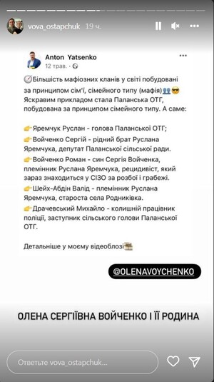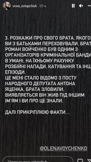 По словам Остапчука, у родного брата Елены – серьезные проблемы с законом. «Брат Роман Войченко был одним из организаторов криминальной банды в Умани. На их счету разбойные нападения, пытки и другие эпизоды. Мне это стало известно из поста народного депутата Антона Яценко. Брата поймали. Оказывается, он жил под другим именем и вы это знали», – заявил телеведущий.