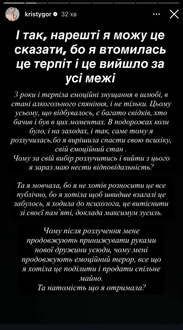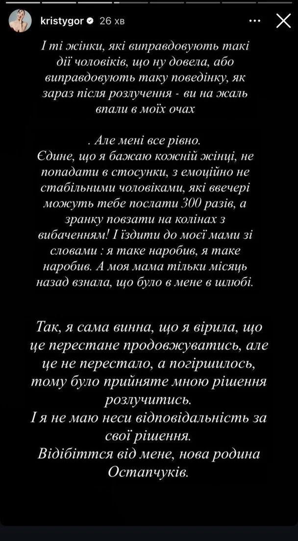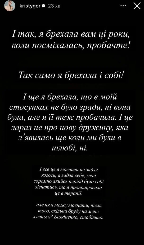 Христина Горняк також зізналася, що колишній чоловік їй зраджував. «І так, я брехала вам ці роки, коли посміхалась, пробачте! Так само я брехала і собі! І ще я брехала, що в моїй стосунках не було зради, ні вона була, але я її теж пробачила. І це зараз не про нову дружину, яка з'явилась ще коли ми були в шлюбі, ні», – заявила Горняк.