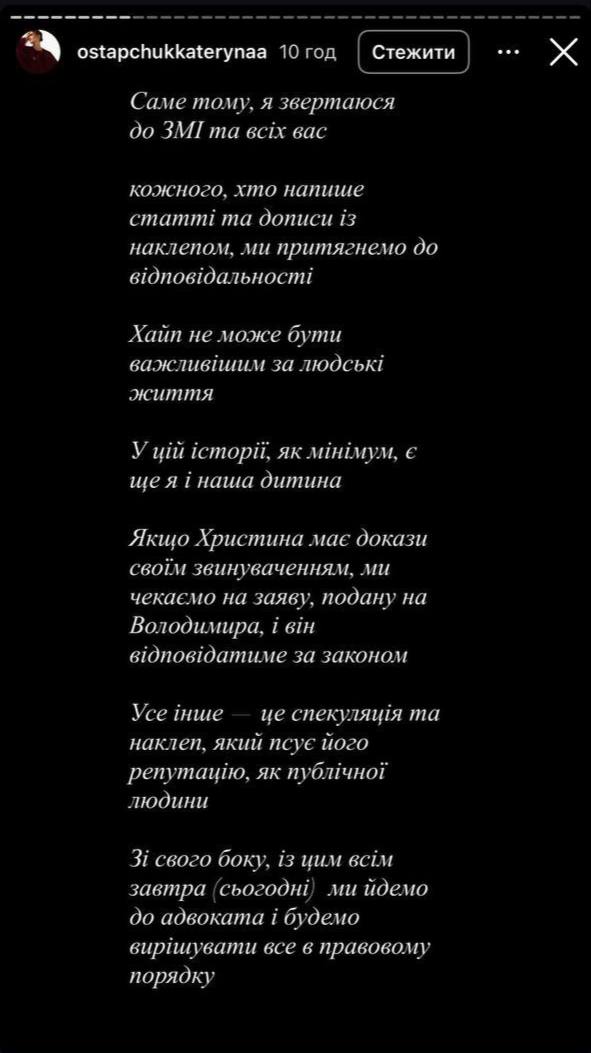 За словами нотаріусині, Володимир Остапчук вибачався за свої вчинки перед її матір’ю. «Єдине, що я бажаю кожній жінці, не попадати в стосунки, з емоційно не стабільними чоловіками, які ввечері можуть тебе послати 300 разів, а зранку повзати на колінах з вибаченням! І їздити до моєї мами зі словами: «Я таке наробив, я таке наробив».