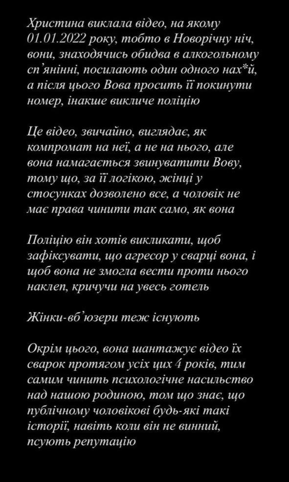 «Ви обидва сварилися. Ви обидва кричали. Ви обидва використовували ненормативну лексику. Систематичне знущання, як ти говориш, було у вас взаємне. Чи ти вважаєш, що над Вовою можна знущатися, а над тобою ні? Так, у вас не склався шлюб. Так, ви не вміли домовлятися у сварках і поливали одне одного брудом, але це було взаємно», – написала Полтавська.