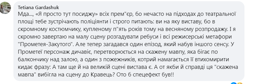 Інші глядачі також відреагували на виставу, ділячись власними враженнями як від постановки, так і від гри Кравець. «Війна дуже оголила суть всіх речей, все надумане і несправжнє стало якимось нецікавим і нудним, а щирість і енергетична щедрість навпаки стали ще більш помітними і цінними», – пише одна з користувачок Instagram.