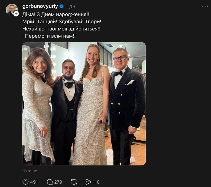 «Діма! З Днем народження!! Мрій! Танцюй! Здобувай! Твори!! Нехай всі твої мрії здійсняться!! І Перемоги всім нам!!» – написав Горбунов.