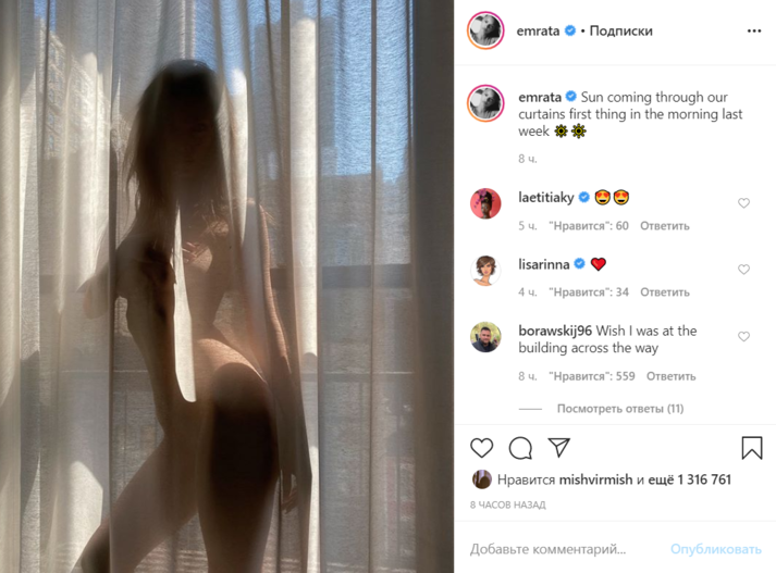 Американская супермодель Эмили Ратаковски поделилась серией откровенных снимков с поклонниками. Кадры появились в stories в официальном Instagram-аккаунте знаменитости.