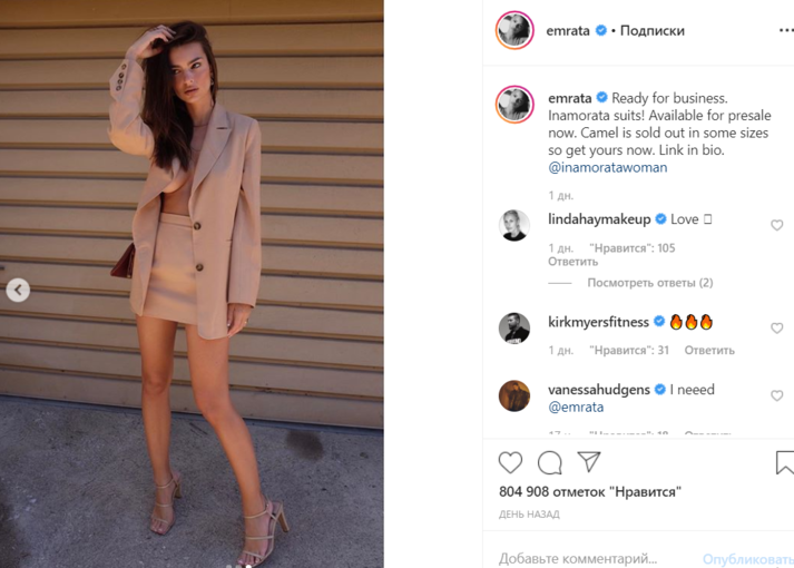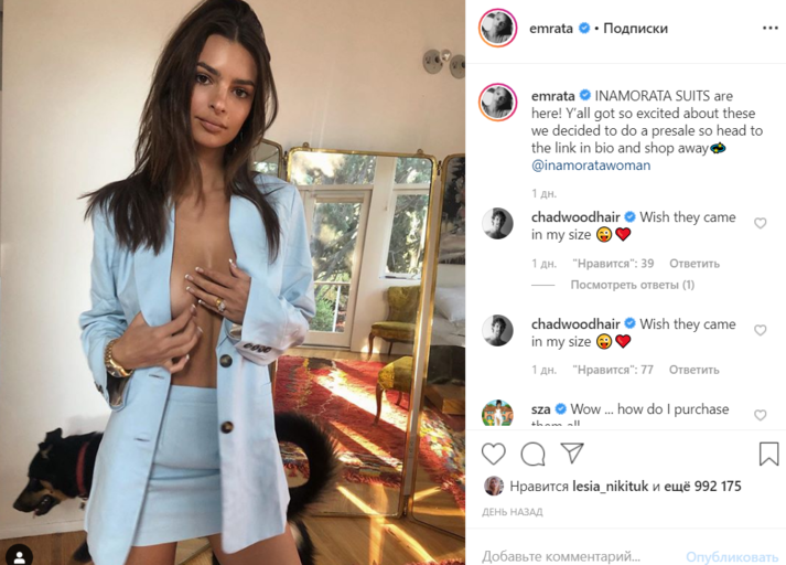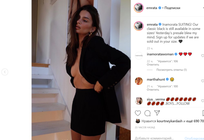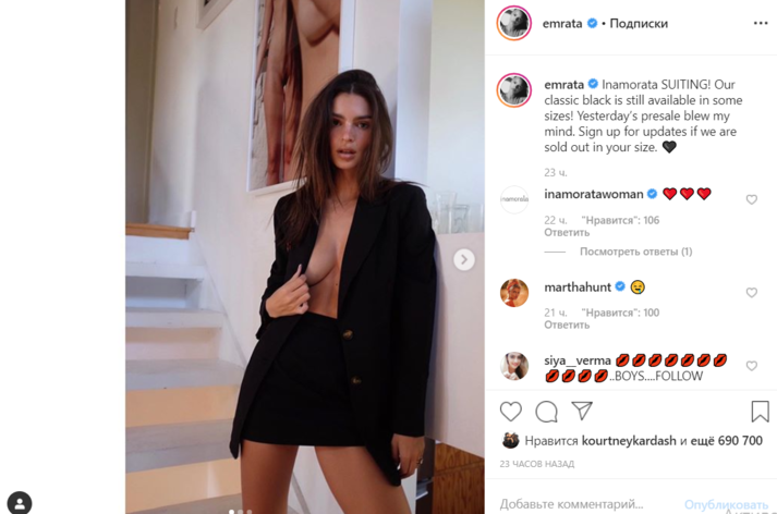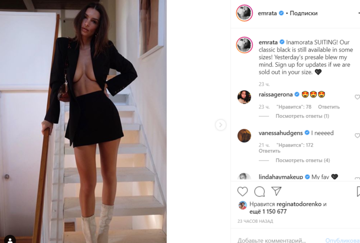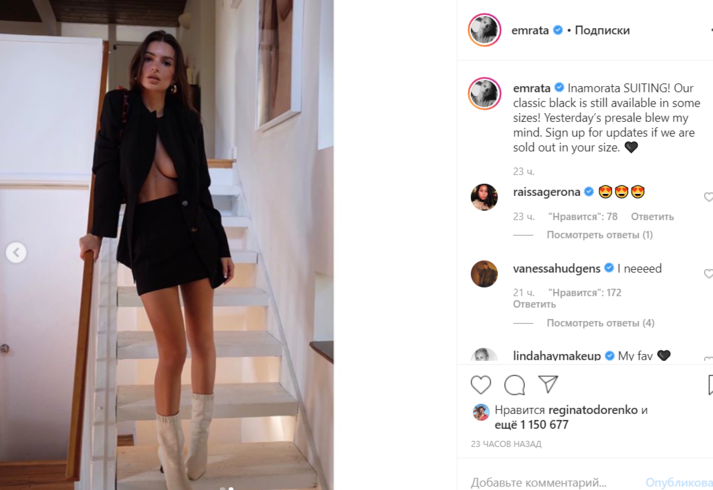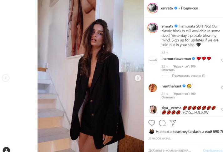 Поклонники восхитились новым аутфитом звезды. Они обратили внимание на пикантную картину за спиной Эмили. «Ух, какая!», «Девушка-огонь!», «Крутая, как всегда», «Вот это фигурка!», «Ты самая красивая, хоть и не обнажена», «Ничего себе! Потрясающая, удивительная малышка!», «Фон выбрала что надо», «Сексапильно», – написали фолловеры.