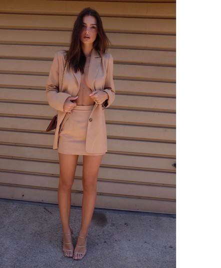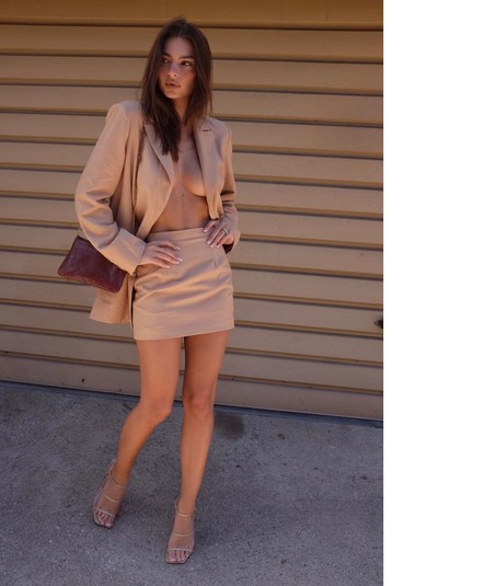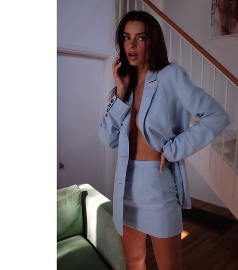 Американская звезда 28-летняя Эмили Ратаковски примерила эффектный костюм собственного дизайна. Она позировала возле картины, на которой изображена оголенная женщина. Эмили надела на голое тело черный жакет и короткую юбку такого же цвета. Инстадива кокетливо расстегнула пуговицы на груди, хвастаясь роскошными формами. Секс-бомба по привычке не стала скрывать свой знаменитый бюст под бельем.