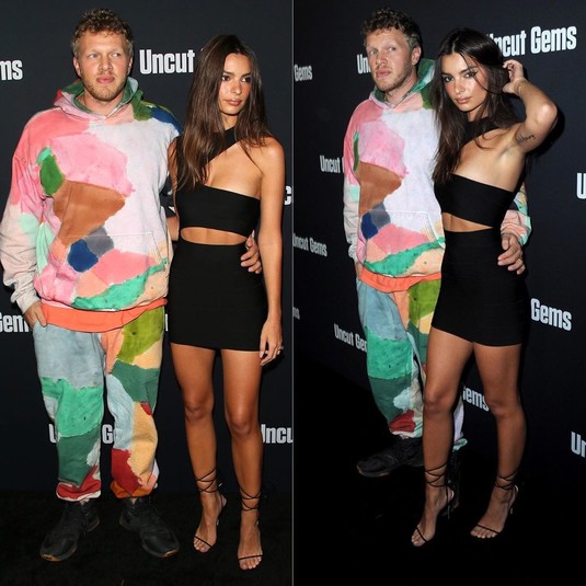 28-летняя Эмили Ратаковски вышла на красную дорожку премьеры фильма в total black look. Она надела мини-платье с пикантными разрезами на животе и по бокам. Звезда дополнила образ эксклюзивными украшениями собственного бренда - крупными серьгами в форме женской фигуры и золотым браслетом. Ее супруг выбрал разноцветный спортивный костюм.