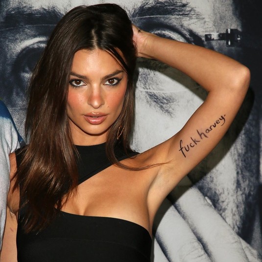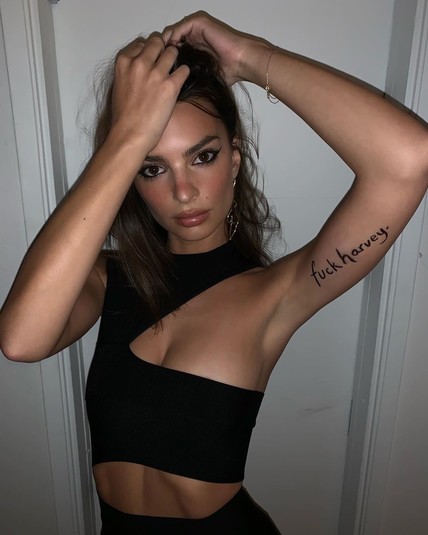 Фотографы обратили внимание на надпись, сделанную на внутренней стороне предплечья Эмили: «Иди к черту, Харви». Эта фраза адресована скандальному продюсеру Харви Вайнштейну. Секс-бомба объяснила смысл надписи.