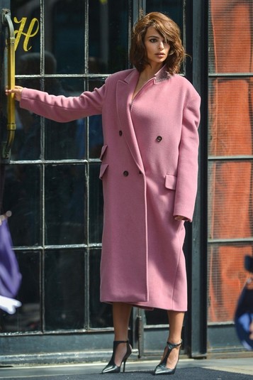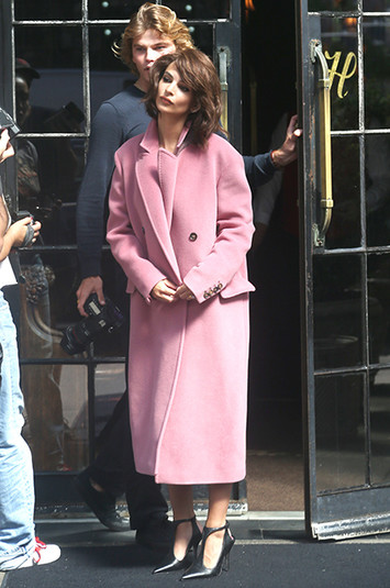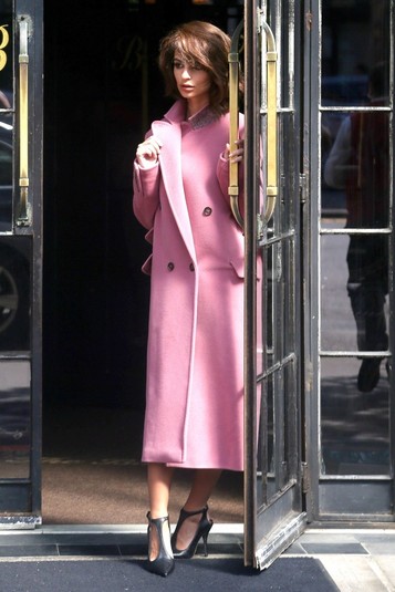 Для этого Ратаковски сделала короткую пышную прическу и надела одежду эпохи 60-х. Верх ее пальто по стилистике такой же как и печально известный розовый жакет Джеки.