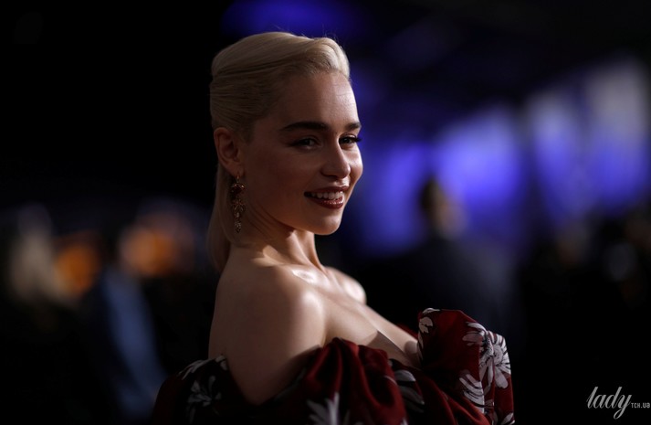 Бордовая модель с открытыми плечами, украшенная цветочным орнаментом, подчеркнула хрупкую фигуру актрисы и ее образ платиновой блондинки. Поклонники отметили, что Эмилия выглядела сногсшибательно.