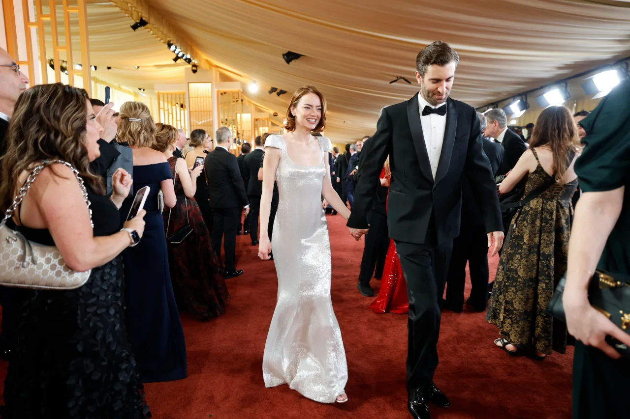 Для появи на головній кіноподії року Стоун обрала розкішну білу сукню від модного Дому Louis Vuitton, амбасадоркою якого вона є ще з 2017 року. Вбрання з квадратним вирізом, відкритою спиною та короткими рукавами було повністю розшите паєтками. Як повідомляє InStyle, створення цієї ефектної сукні вимагало кропіткої ручної роботи, яка тривала понад 600 годин.