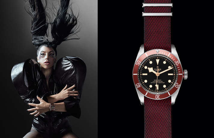 На первом кадре из новой рекламной кампании Леди Гага позирует, как в старые добрые времена, в экстравагантном образе, который привлекает куда большее внимание к ее внешнему виду и прическе, нежели к собственно часам (на снимке певица демонстрирует модель Heritage Black Bay Red). Наряду с Леди Гага амбассадором бренда Tudor является Дэвид Бекхэм.