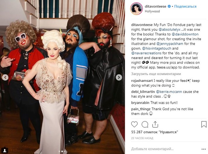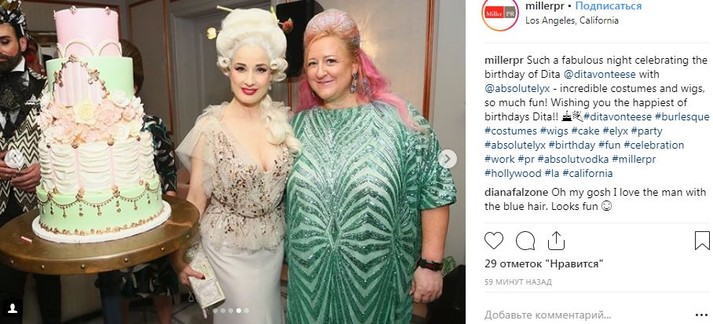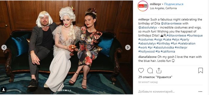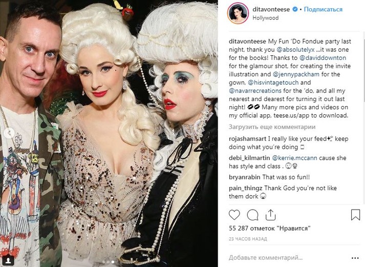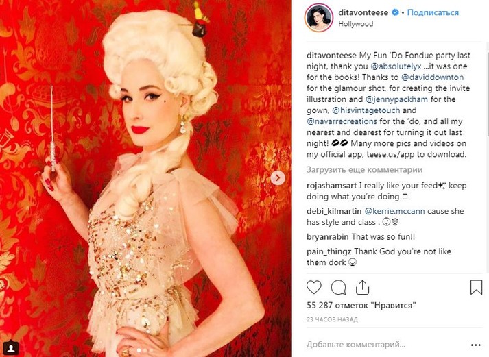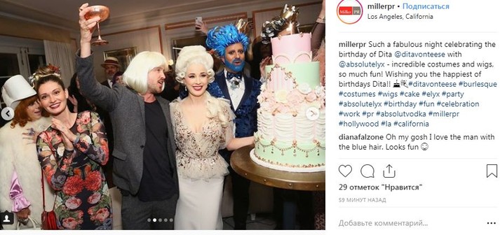 По этому случаю именинница закатила в выходные вечеринку для своих в одном из ресторанов Лос-Анджелеса. А попасть на нее можно было только в парике в стиле конца 18 века. Именно такой дресс-код установила Дита для друзей.