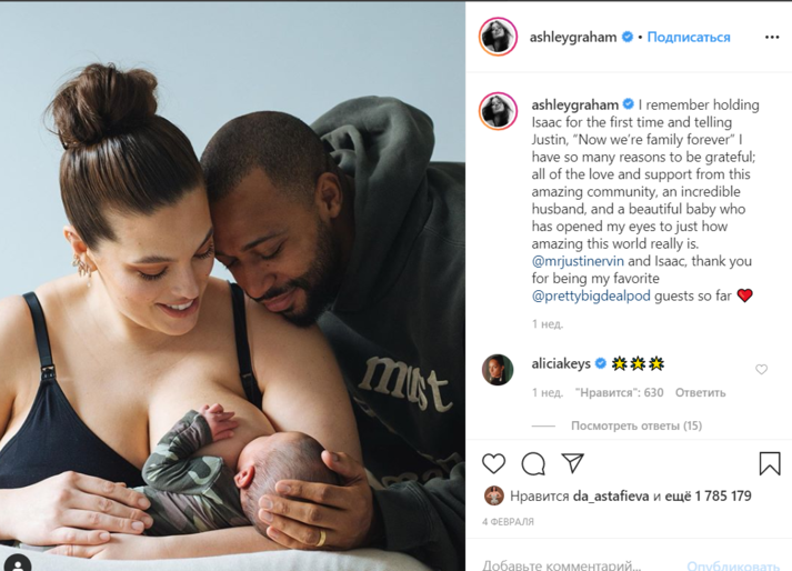 Напомним, что Эшли Грэм и ее супруг Джастин Эрвин впервые стали родителями месяц назад. С тех пор знаменитая plus-size-модель часто рассказывает поклонникам обо всех трудностях, с которыми сталкиваются родившие женщины.