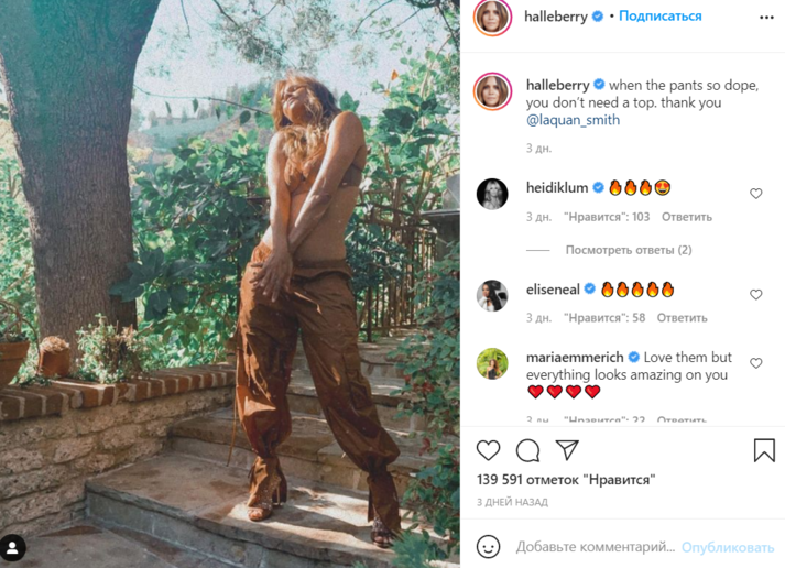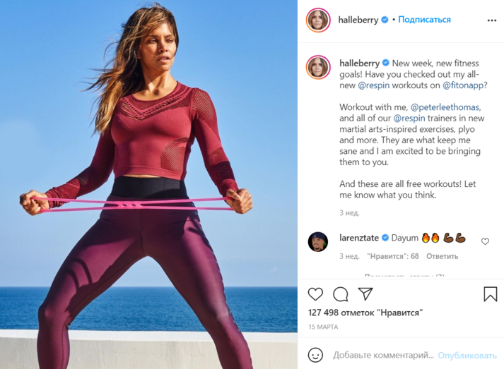 В марте Холли Берри поделилась секретом своей cтройной фигуры. Согласно материалу, актрисе удается держать себя в форме благодаря регулярной физической активности. Звезда запустила серию авторских тренировок в бесплатном фитнес-приложении FitOn. «Это даст вам возможность попробовать нашу программу, направленную на занятия спортом в домашних условиях. Многие упражнения вдохновлены боевыми искусствами и требуют выносливости. Они заставят ваше сердце биться быстрее!» — заявила она.