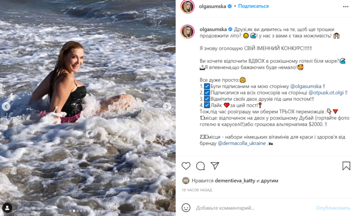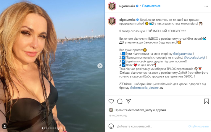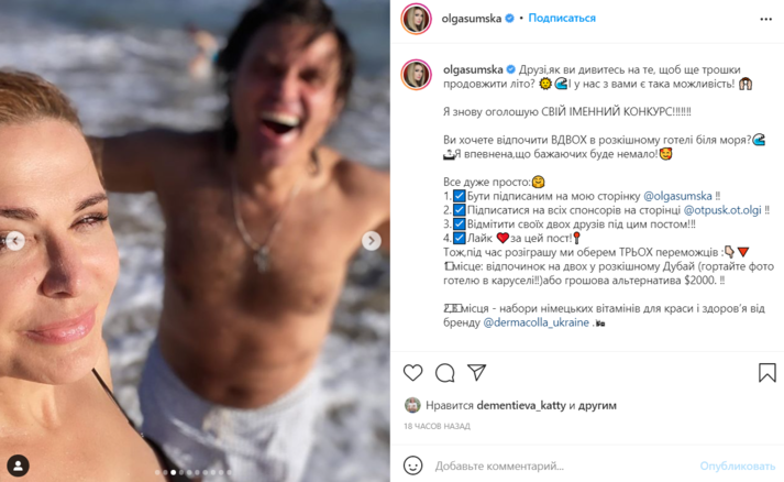 Легендарная украинская актриса Ольга Сумская в своем Инстаграме опубликовала фотосет со своего недавнего отдыха в Дубае. На снимках улыбчивая Сумская позирует вместе с мужем, актером Виталием Борисюком плещутся в волнах теплого моря.