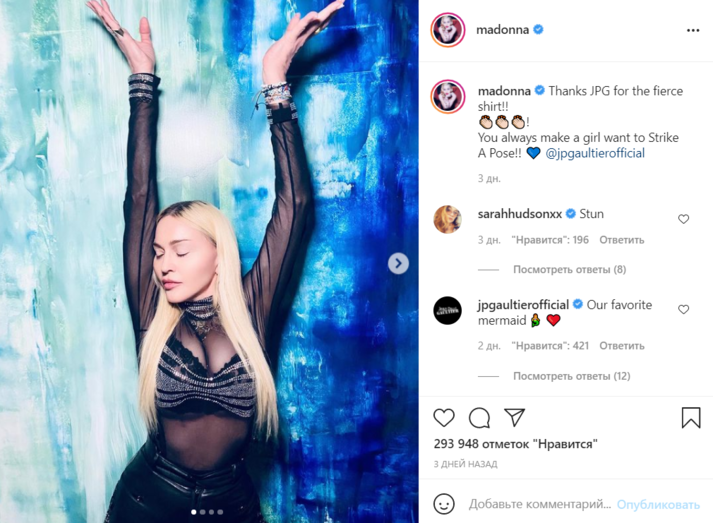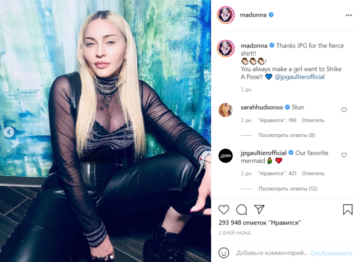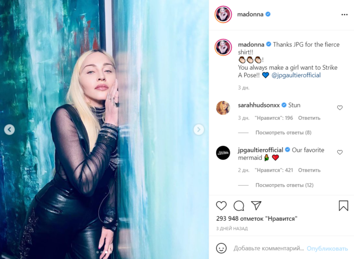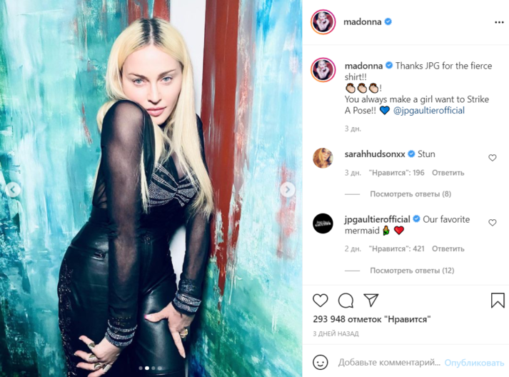 «Ты всегда можешь заставить девушку позировать», — кокетливо обратилась к дизайнеру Мадонна. Поклонники остались в восторге от знойной фотосессии артистки и не поскупились на комплименты в ее адрес. «Ей точно 62? Я в шоке!», «Красотка на миллион», «Кажется, она остановила время», «Такая же горячая, как и 30 лет назад», — написали фолловеры.