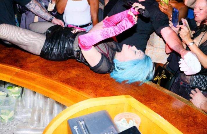 Помимо того что Мэдж выступала прямо на барной стойке, многих впечатлил ее наряд — певица появилась в клубе в кожаных мини-шортах, голубом парике и с практически голой грудью. Во время горячего выступления ей удалось собрать более 100 тысяч долларов, которые будут направлены на решение вопросов ЛГБТ-сообщества.
