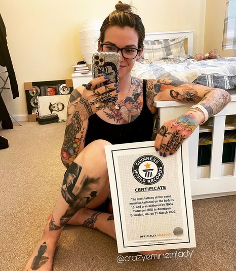 Никки Паттерсон из Шотландии вошла в Книгу рекордов Гиннесса благодаря многочисленным татуировкам с портретом одного и того же музыканта — Эминема. Об этом сообщает Fox News.
